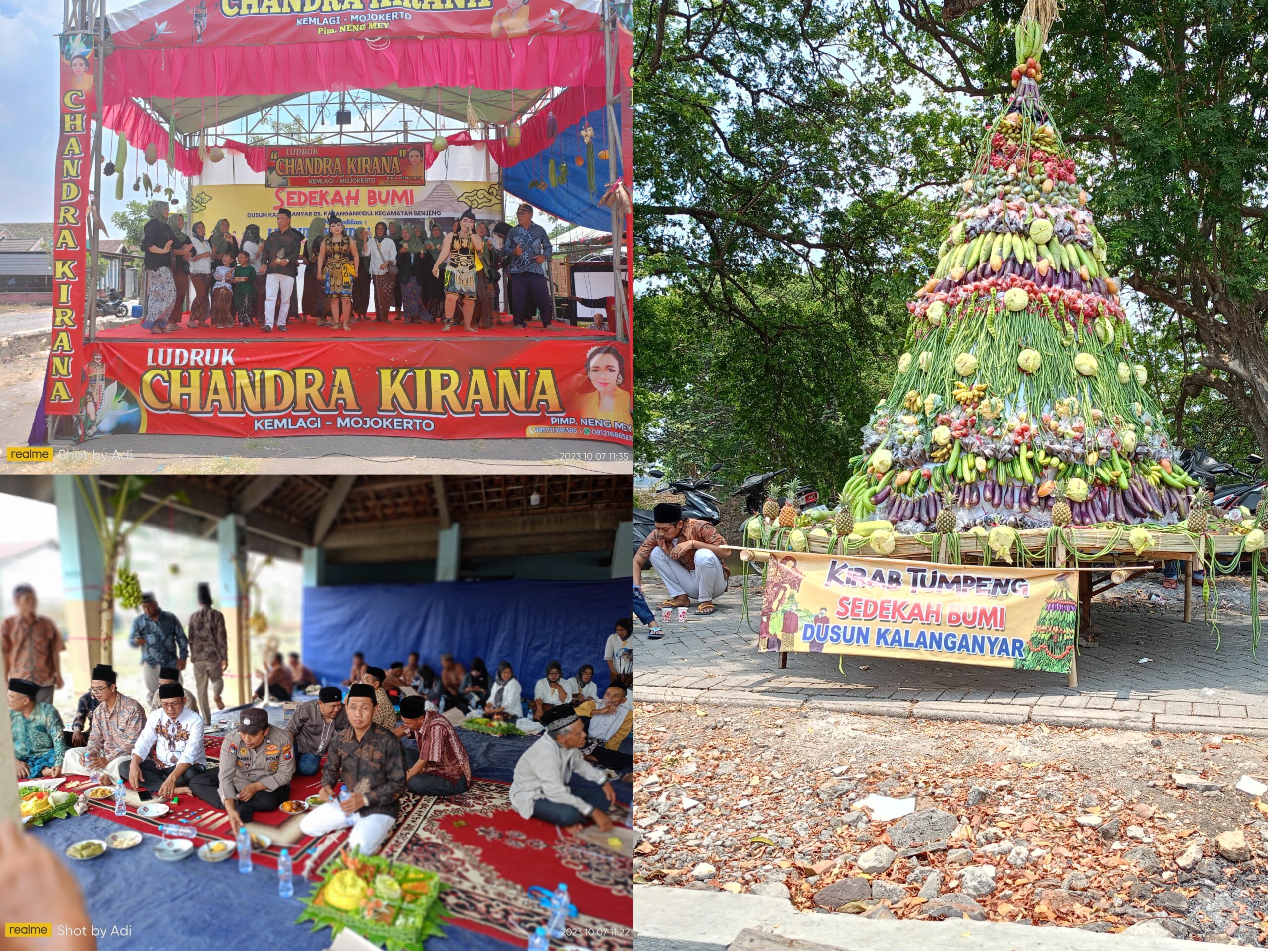 Selain Gunungan tumpeng yang terbuat dari hasil bumi, terlihat juga warga membawa tumpeng Nasi kuning dan nasi putih, serta buah- buahan dan masyarakat juga di hibur oleh pagelaran Ludruk Candra Kirana dari Kemlagi Mojokerto.