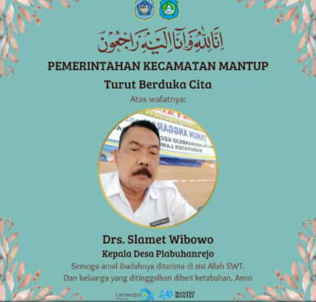 Drs. Slamet Wibowo saat ini menjabat kepala Desa Pelabuhanrejo, Kecamatan Mantup, Kabupaten Lamongan. Dikabarkan meninggal dunia pada Minggu 08/10/202