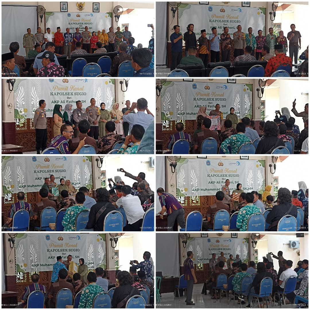 Lamongan. Mediabangsanews.com || Acara Pamit kenal Kapolsek Sugio dari Akp Ali Fatoni S,H, kepada Akp Muhammad Lukman Hadi, S.H., M,H, digelar di Pendopo Kecamatan Sugio. Pada Kamis 19/10/2023