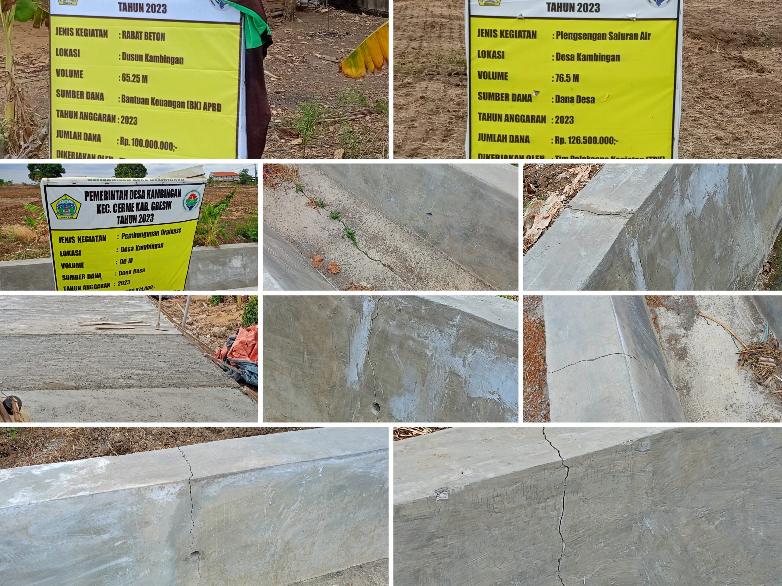Proyek tersebut sudah selesai dikerjakan namun sangat disayangkan proyek yang selesai dibangun tersebut yang tergolong masih seumur jagung sudah banyak ditemukan keretakan- keretakan. Ada dugaan dalam pengerjaannya kurang benar serta tidak dijelaskan secara rinci di papan anggaran seperti tinggi drainase, lebar drainase,