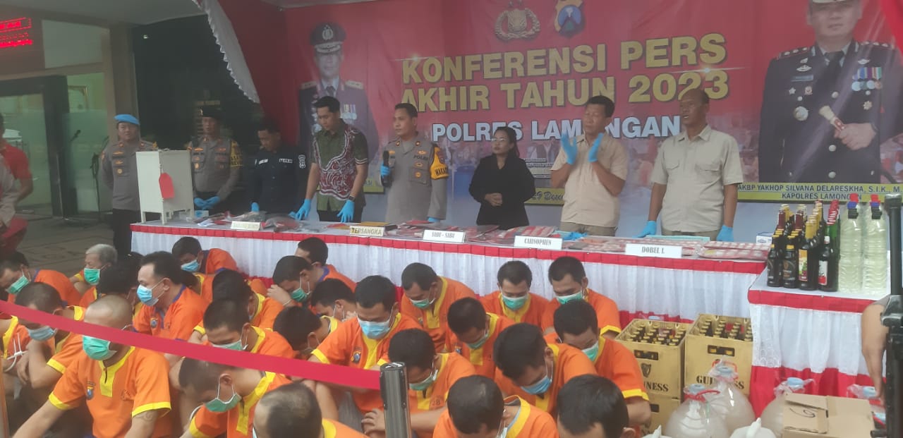 Kapolres Lamongan AKBP Yakhob Silvana Delareskha, S.I.K., M.Si. melalui Wakapolres Lamongan Kompol Akay Fahli, S.Kom, S.I.K, M.Si, menyampaikan hasil ungkap kasus yang dicapai, Satnarkoba selama tahun 2023, sebanyak 70 kasus, jumlah tersangka 102 orang ( terdiri dari 99 laki-laki dan 3 perempuan).