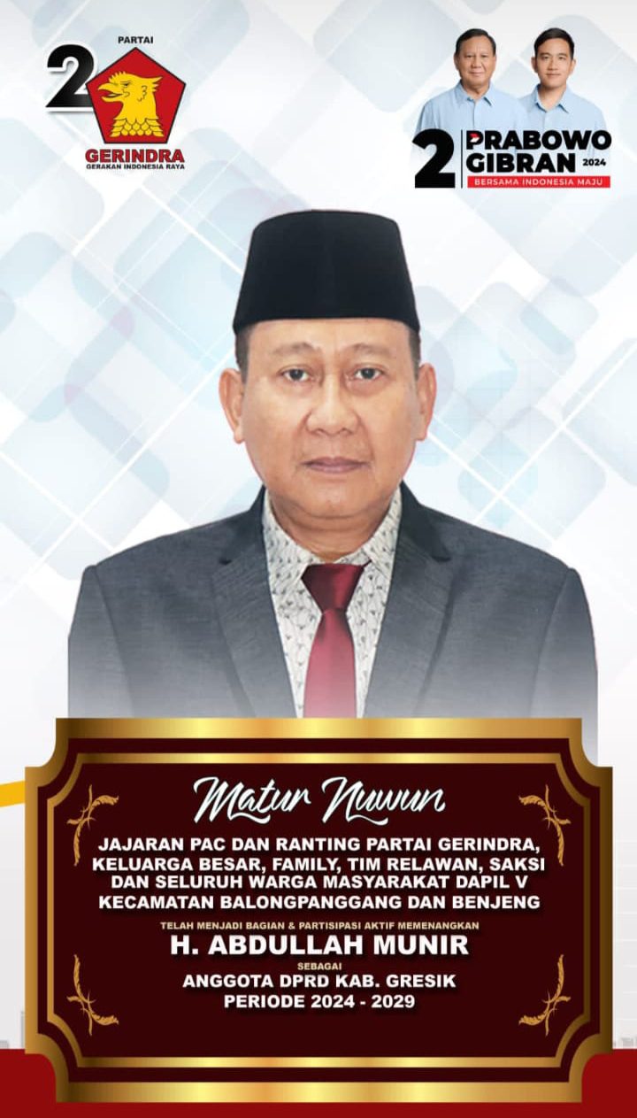 Gresik Mediabangsanews.com ||Politisi dari Partai Gerakan Indonesia Raya  (Partai Gerindra) H. Abdullah Munir  maju kembali di Pemilu 2024 sebagai Calon Legislatif (Caleg) DPRD kabupaten Gresik di Dapil 5 (Balongpanggang – Benjeng).