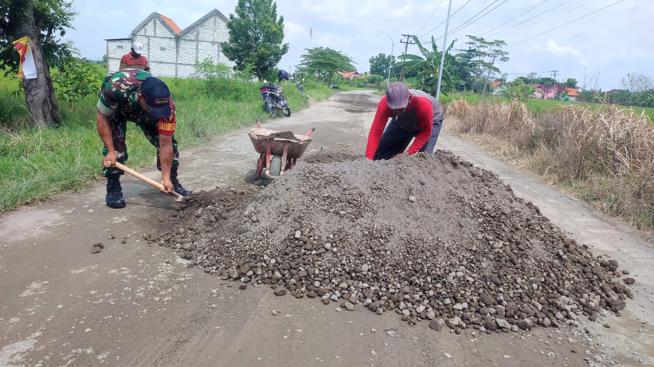 “Melihat kondisi jalan berlubang memang sangatlah rawan, sebagai antisipasi, bersama-sama warga setempat melakukan penimbunan dengan pasir dan batu sebagai langkah awal mengatasi kerawanan,”ujar Babinsa saat bersama warga menimbun lubang pada jalan.