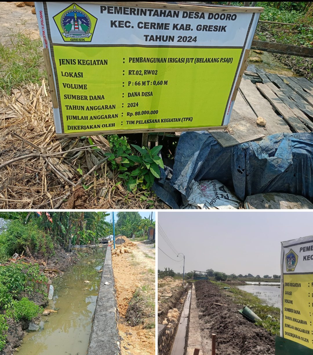 Pembangunan tersebut dengan judul di papan anggaran bertuliskan Pembangunan irigasi JUT (Ganjaran pak kades). Dengan Volume P. 60,80 M T. 0,70 M anggaran Dana Desa 2024 Sebesar Rp.80 juta.