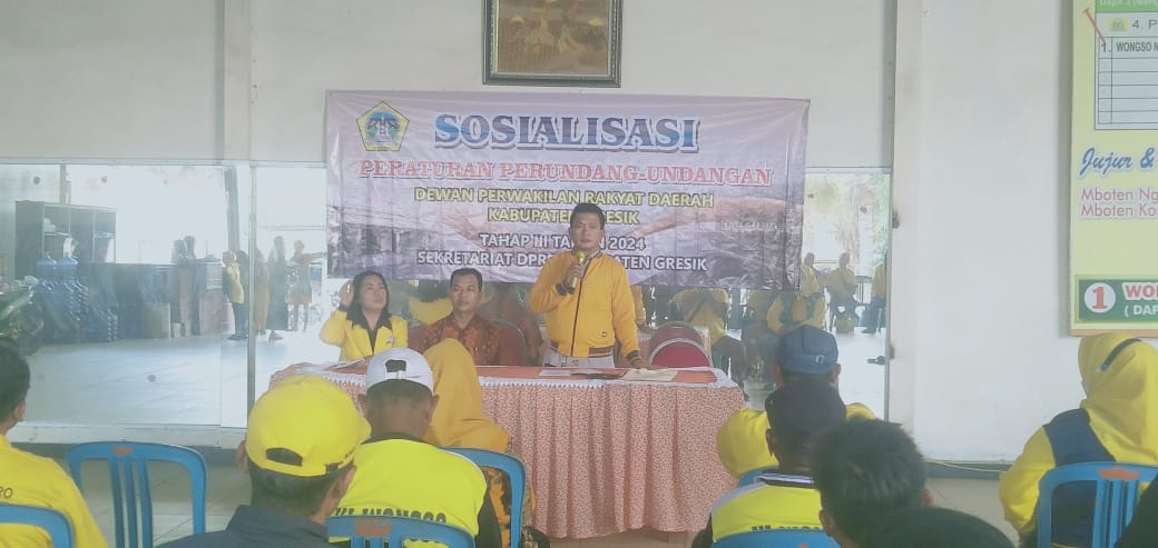 Komisi 1 DPRD Kabupaten Gresik dari partai Golkar Wongso Negoro, S.E., S.H., M.Si. mensosialisasikan Peraturan Daerah (Perda) Kabupaten Gresik nomor 2 Tahun 2022 tentang penyelenggaraan ketentraman dan ketertiban umum serta perlindungan masyarakat dan Perda Kabupaten Gresik nomor 11 Tahun 2020 tentang fasilitas pencegahan dan penanggulangan Narkotika dan Perkusor Narkotika dengan didampingi Kasie Operasi dan Pengendalian Satpol PP Gresik, Umar sebagai narasumber.