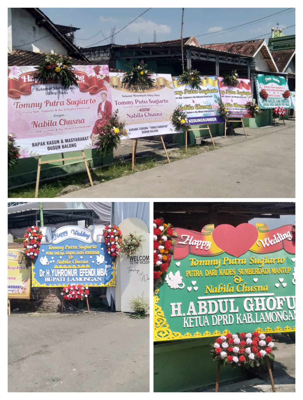 Karangan bungah tersebut bertuliskan “Happy Wedding Tommy Putra Sugiarto dan Nabila Chusna” membanjiri kediaman Kepala Desa Sumberdadi.