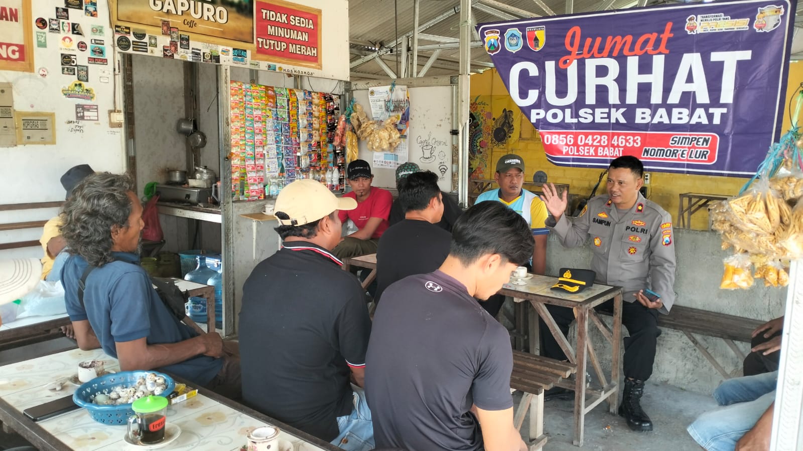 Hadir langsung, Kompol Sampun, S.H. (Kapolsek Babat), bersama anggotanya dan Warga Kampung Desa Truni di warung kopi .