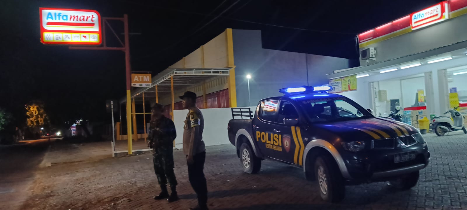 “Kehadiran anggota TNI/POLRI di tengah masyarakat utamanya di tempat Obyek vital Alfamart untuk memberikan himbauan kamtibmas, Juga untuk memberikan motivasi terhadap warga.” Pungkasnya.”