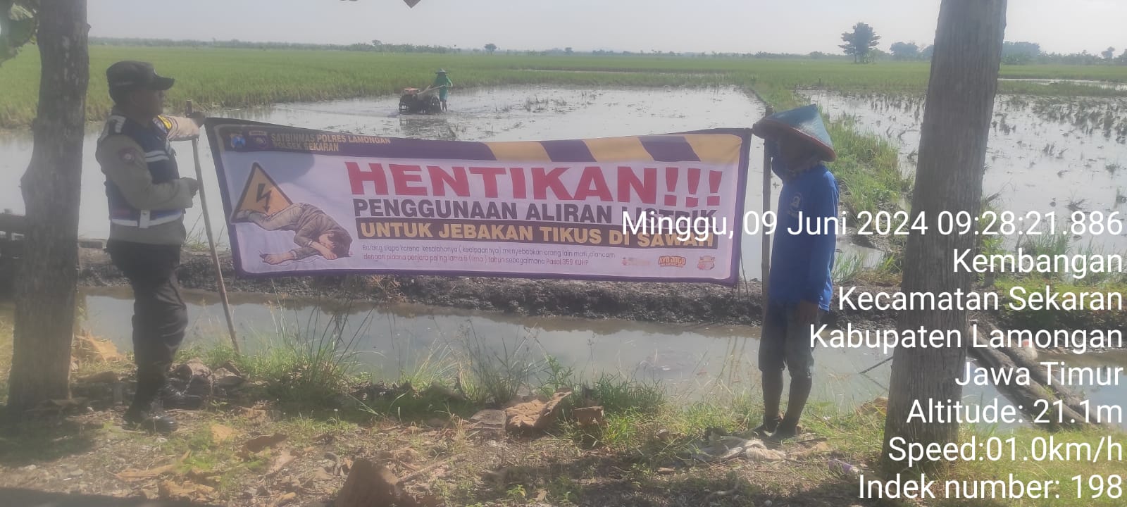 Lamongan, Mediabangsanews.com || Polsek Sekaran melaksanakan sosialisasi dan himbauan kepada para petani di Desa Kembangan Kecamatan Sekaran terkait bahaya penggunaan jebakan tikus beraliran listrik. (09/06/24)