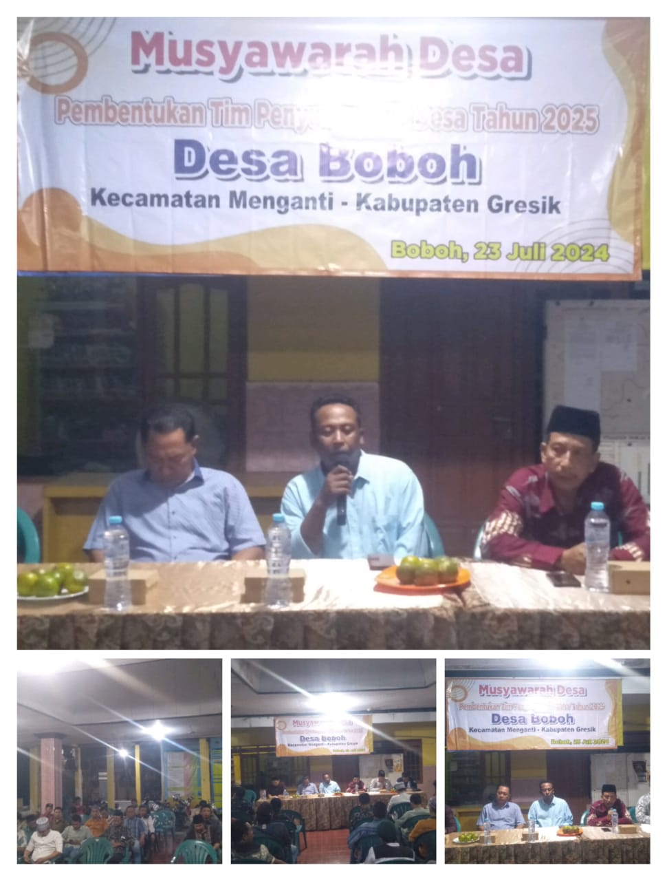 Kepala Desa (Kades) Boboh Abdul Majid melaksanakan kegiatan Musyawarah Desa (Musdes) pembentukan Tim penyusunan Rencana Kerja Pemerintahan Desa (RKPdes) Tahun anggaran 2025 yang dilaksanakan di pendopo balai desa Boboh Kecamatan Menganti Kabupaten Gresik, Selasa (23/07/2024). Malam