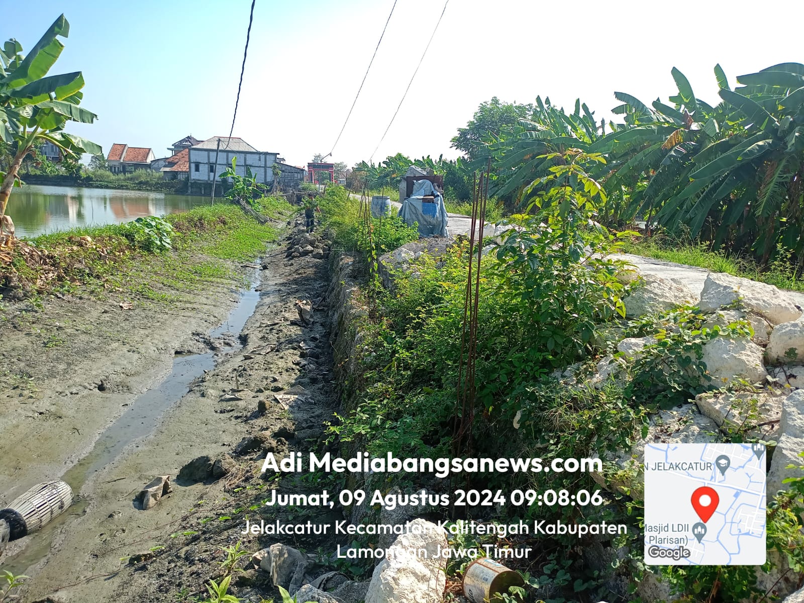 Proyek pembangunan Tembok Penahan Tanah (TPT)  yang ada di Dusun Plarisan, Desa Jelakcatur, Kecamatan Kalitengah, Kabupaten Lamongan Mangkrak.