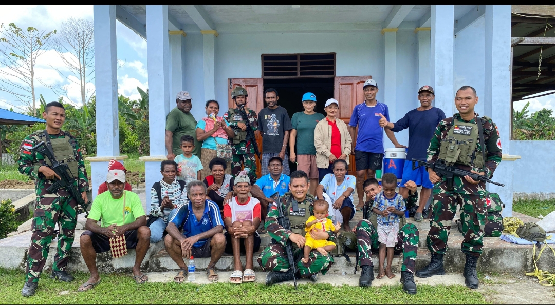 Satgas Yonif 512/Quratara Yudha (QY) Pos Komando Utama (Kout) yang bertugas di wilayah Senggi, Kabupaten Keerom, menunjukkan kepeduliannya kepada masyarakat sekitar dengan berbagi kebahagiaan dengan masyarakat, menciptakan senyuman dan kebersamaan yang hangat. Senggi, Keerom Selasa, (24/09/2024).