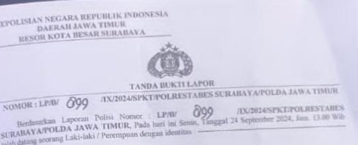 Didampingi oleh Kuasa hukumnya, Sukardi dan Abdul Rauf, laporan Polisi diterima oleh Banit 1 SPKT Polrestabes Surabaya, Bripka Imam Nurdiansah, dengan register nomor LP/B/899/IX/2024/SPKT/POLRESTABES SURABAYA / POLDA JAWA TIMUR, tanggal Senin, 23 September 2024.