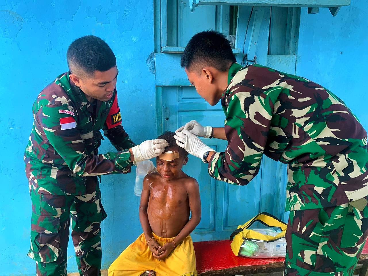 Bantuan medis dari Satgas sangat dirasakan langsung oleh masyarakat. Salah satu Masyarakat, *Mama Bernard, mengungkapkan rasa terima kasihnya* setelah anaknya yang mengalami luka robek di kepala yang mengharuskan dijahit akibat terjatuh berhasil mendapat penanganan cepat dari tim medis Satgas Yonif 512/QY.