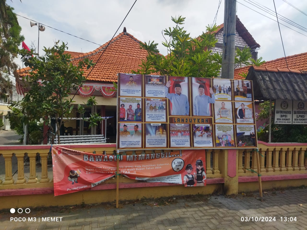 Alat peraga kampanye bergambar salah satu pasangan calon Bupati dan Wakil Bupati Gresik Fandi Akhmad Yani – Asluchul Alif terpampang di depan Kantor Desa Sukowati, Kecamatan Bunga, Kabupaten Gresik.