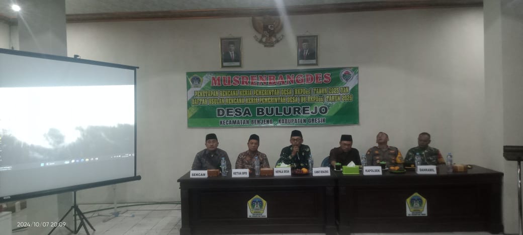 Pemerintah Desa (Pemdes) Bulurejo melaksanakan Musyawarah Perencanaan Pembangunan Desa (Musrenbangdes) Penetapan RKPDes Tahun Anggaran (TA) 2025 dan Daftar Usulan (DU) RKPDes Tahun 2026, yang dilaksanakan di pendopo balaidesa Bulurejo Kecamatan Benjeng Kabupaten Gresik, Senin (07/10/2024). Malam