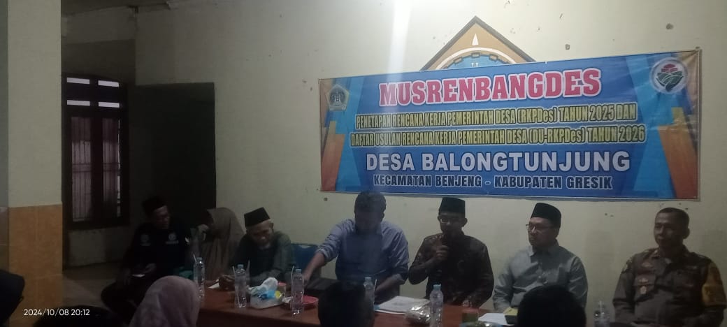 Pemerintah Desa (Pemdes) Balongtunjung melaksanakan Musyawarah Perencanaan Pembangunan Desa (Musrenbangdes) Penetapan RKPDes Tahun Anggaran (TA) 2025 dan Daftar Usulan (DU) RKPDes Tahun 2026, yang dilaksanakan di pendopo balaidesa Balongtunjung Kecamatan Benjeng Kabupaten Gresik, Selas (08/10/2024). Malam