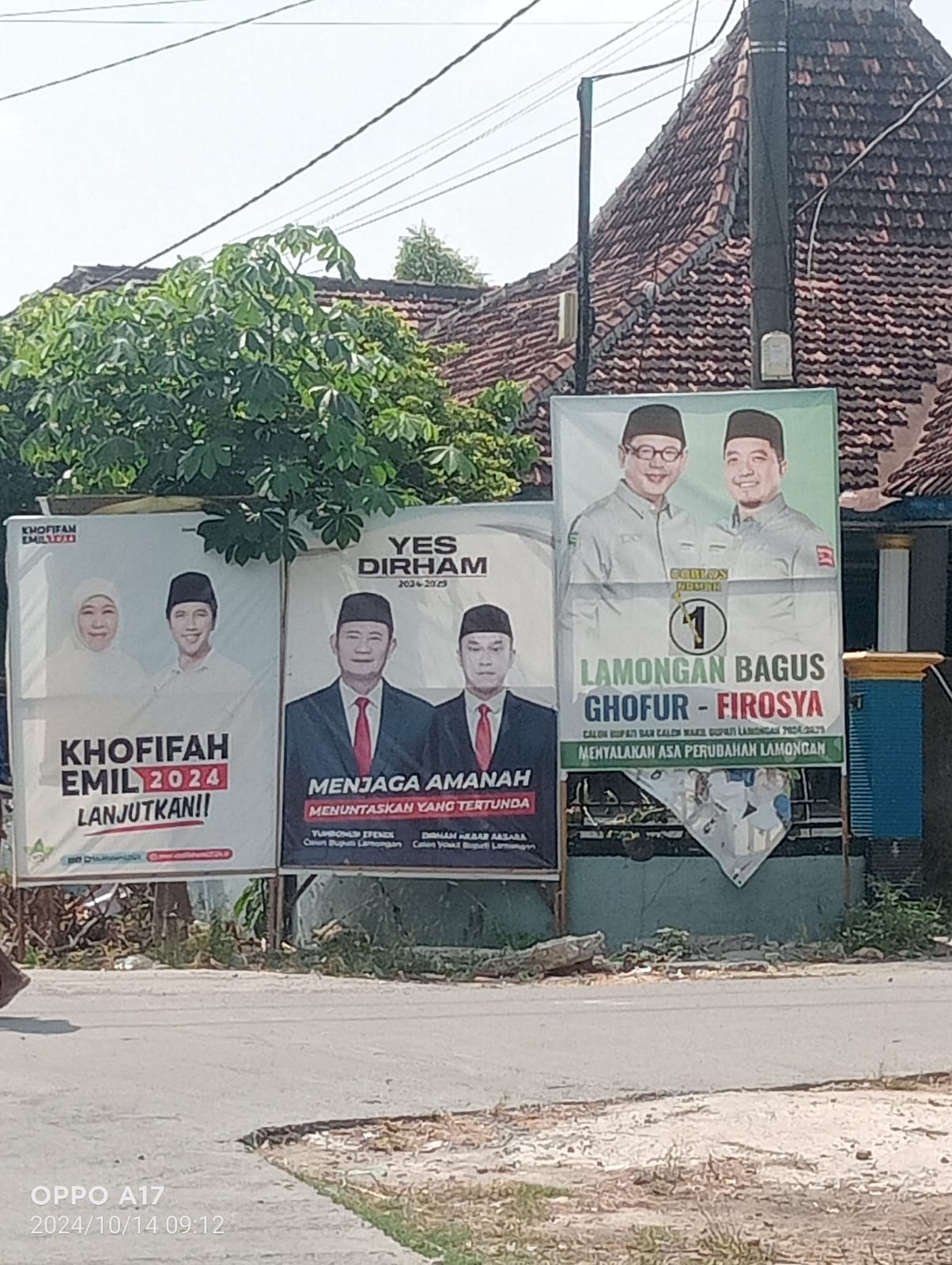 Alat Peraga Kampanye dari Pasangan Bupati dan wakil Bupati Kabupaten Lamongan yakni Pasangan No 1 Ghofur- Firosya dan pasangan calon Bupati dan wakil Bupati Yes- Dirham serta Pasangan Calon Gubernur dan wakil Gubernur jati Khofifa- Emil terpampang jelas di Depan dan menempel di pagar Balai Desa Sukosari, Kecamatan Mantup Kabupaten Lamongan.