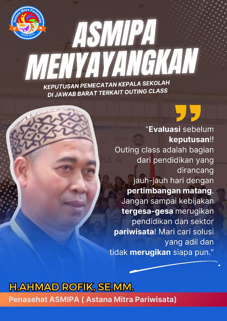 Baru-baru ini, keputusan pemecatan seorang kepala sekolah di Jawa Barat setelah sekolahnya mengadakan kegiatan outing class menuai perhatian publik. Menanggapi hal tersebut, _Penasehat Asosiasi Mitra Pariwisata (ASMIPA),_ Ahmad Rofik SE.,MM.,, menyampaikan pandangannya terkait kebijakan tersebut.
