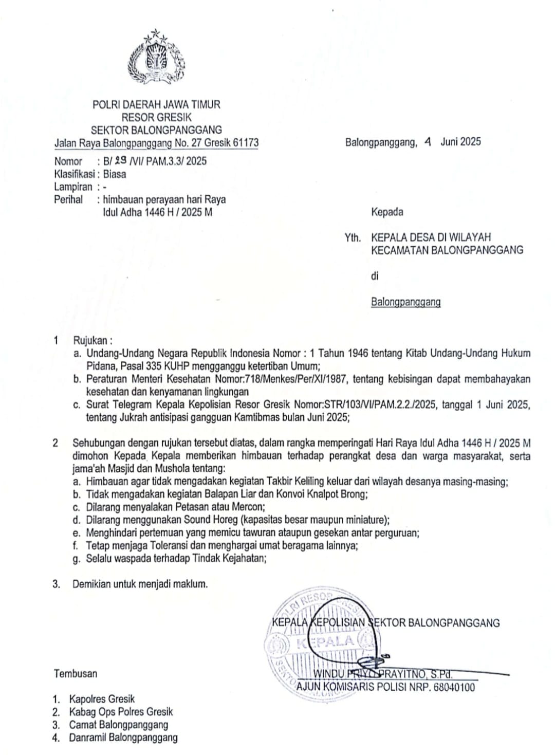 Menyambut Hari Raya Idul Adha 1446 H, Kepolisian Sektor (Polsek) Balongpanggang berikan imbauan kepada semua masyarakat di wilayah Kecamatan Balongpanggang. Imbauan tersebut merujuk Surat bernomor B/89/VI/PAM.3.3/2025 serta surat telegram Kapolres Gresik mengenai antisipasi gangguan kamtibmas selama bulan Juni 2025.