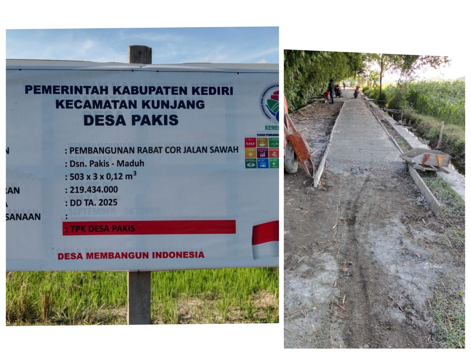 Pembangunan rabat beton jalan menuju ke sawah di Dusun Pakis Maduh, Desa Pakis, Kecamatan Kunjang, Kabupaten Kediri patut di pertanyakan dan di duga menjadi sarang ajang korupsi secara pribadi maupun kelompok.