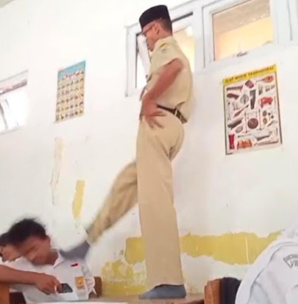 Dalam video berdurasi singkat yang menjadi viral, terlihat seorang pria dewasa, yang diidentifikasi sebagai guru, berdiri di atas meja dan memarahi sejumlah siswa. Tanpa peringatan, ia melayangkan tendangan ke arah kepala salah satu siswa sebanyak dua kali, disaksikan oleh siswa-siswa lain di kelas tersebut.