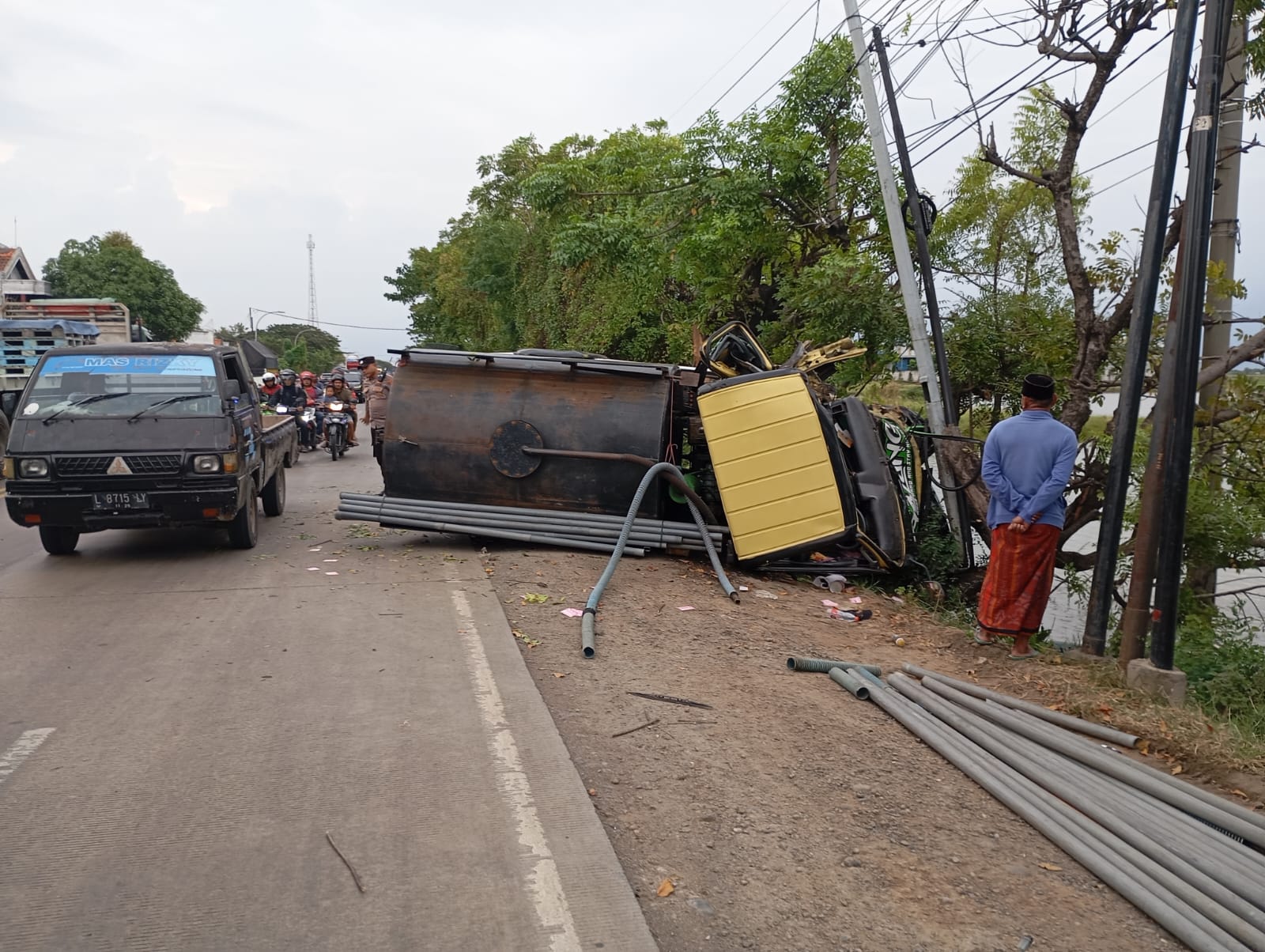 Kendaraan Truck tangki dengan Nopol W 8626 PQ yang dikemudikan Stefanus Didik Andrianto (27) warga Dusun Ngepung Desa Ngepung kecamatan Kedamean bersama penumpang Soniman Zaidan Ally (22) warga Desa Tanjung menabrak tiang Telkom dan pohong sampai terguling di bahu jalan.