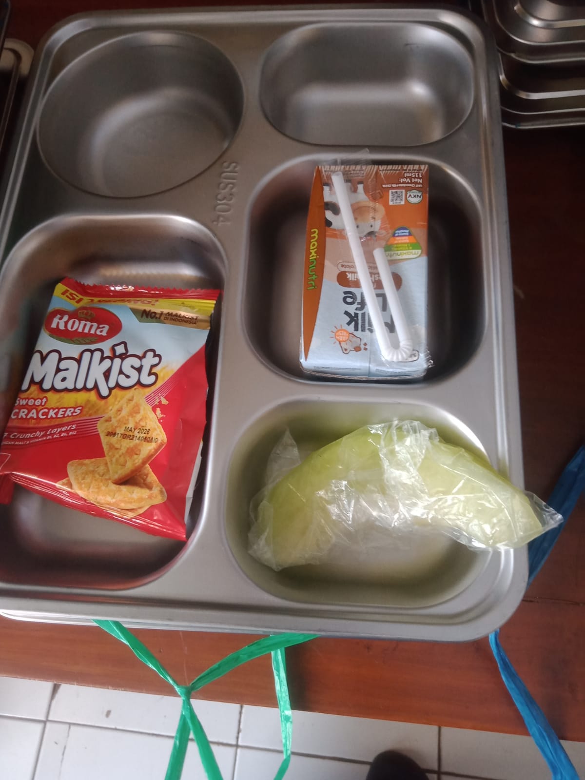 Pasal nya menu yang di sajikan cuma tiga jenis makanan ringan seperti susu kotak kecil dengan merk milk life , jeruk , & kue ROMA SARI GANDUM.