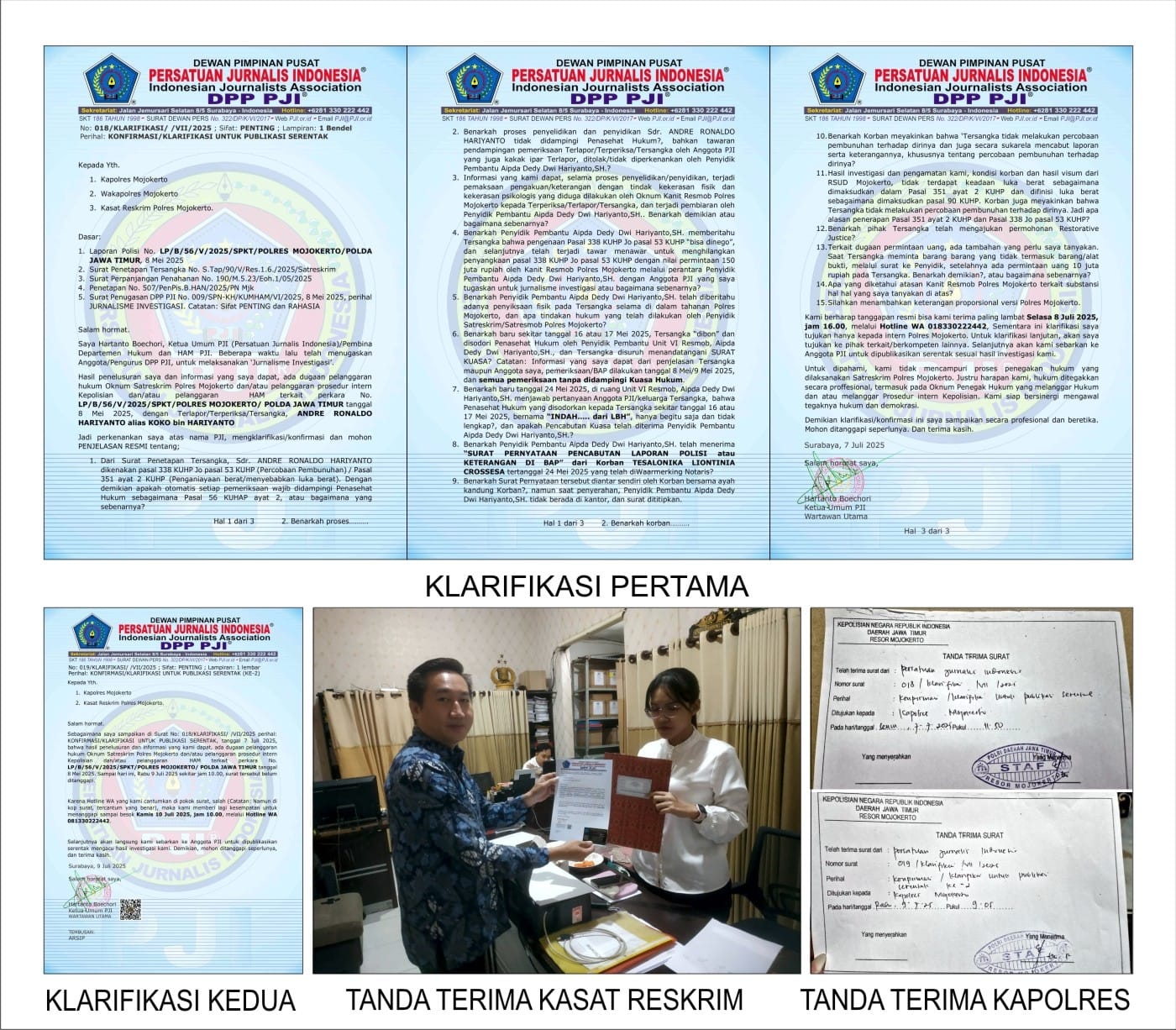 Senin 7 Juli 2025, saya mengirimkan surat klarifikasi/kofirmasi kepada Kapolres Mojokerto dan Kasat Reskrim Polres Mojokerto melalui Surat Klarifikasi No. 018/KLARIFIKASI/VII/2025. Surat diantar langsung. Saya ajukan 14 pertanyaan penting. Sampai batas waktu lewat, tidak ditanggapi. Saya kirimkan lagi Surat klarifikasi ke 2 No. 019/KLARIFIKASI/VII/2025. Namun sampai tulisan ini dipublikasikan, tetap tidak ada tanggapan. Catatan, saat klarifikasi, Kasat Reskrim masih dijabat AKP Nova Indra Pratama. Kasat Reskrim baru ‘Adhi Makayasa’ AKP Fauzy Pratama, sertijab Jum’at 11/5/2025.