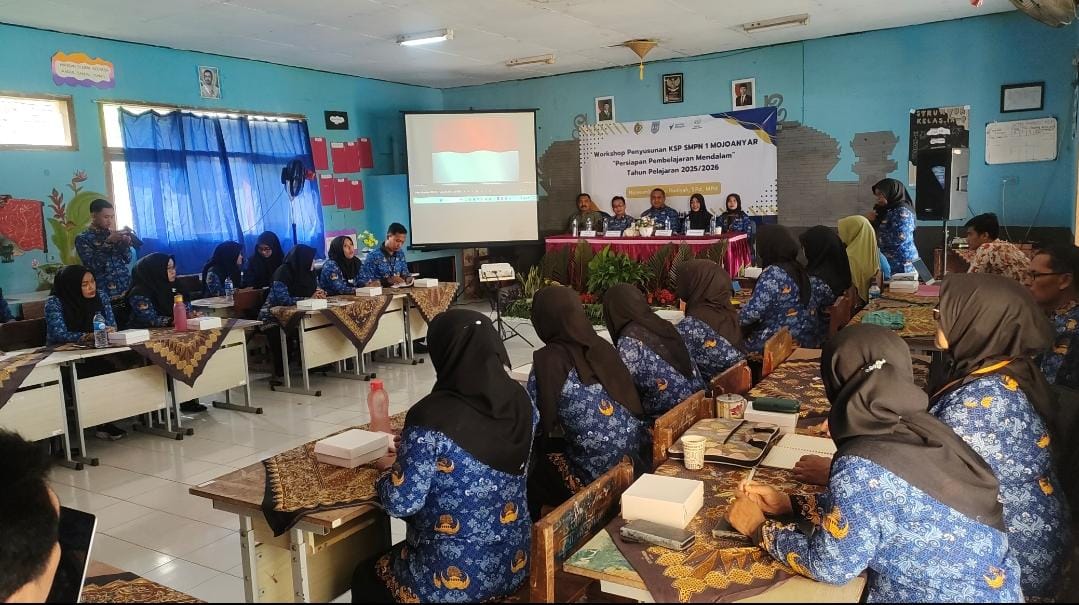 Puluhan tenaga pendidik berkumpul dalam forum serius bertajuk Workshop Penyusunan KSP SMPN 1 Mojoanyar di Jl. Pasinan – Jabon, Pasinan, Jabon, Kecamatan Mojoanyar, Kabupaten Mojokerto. Kamis (17/7/2025) Agenda strategis ini mengusung tema “Persiapan Pembelajaran Mendalam Tahun Pelajaran 2025/2026” dan menjadi titik awal evaluasi menyeluruh sistem pembelajaran di lingkungan sekolah negeri tersebut.