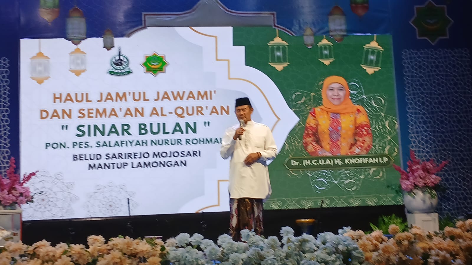 Tak lupa ia juga menyampaikan permintaan maaf terhadap jamaah bahwasannya Gubernur Jawa Timur Dr. (H.A.C.U.A) Hj Khofifa I.P tidak bisa menghadiri dalam acara tersebut di karenakan ada tugas di luar pulau (Lampung).
