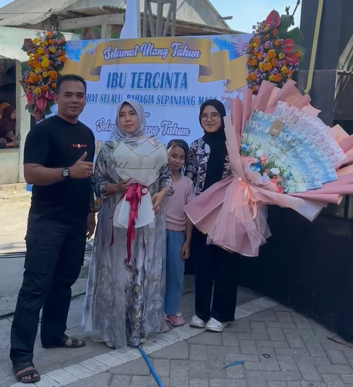 Karangan bunga terpajang dengan pesan mendalam: “Selamat Ulang Tahun Ibu Tercinta, Sehat Selalu, Bahagia Sepanjang Masa”. Doa khusus juga ditujukan untuk usaha kuliner keluarga “Dua Azzahra” dengan kalimat penuh harapan: “Semoga makin renyah, makin dicinta banyak orang”.