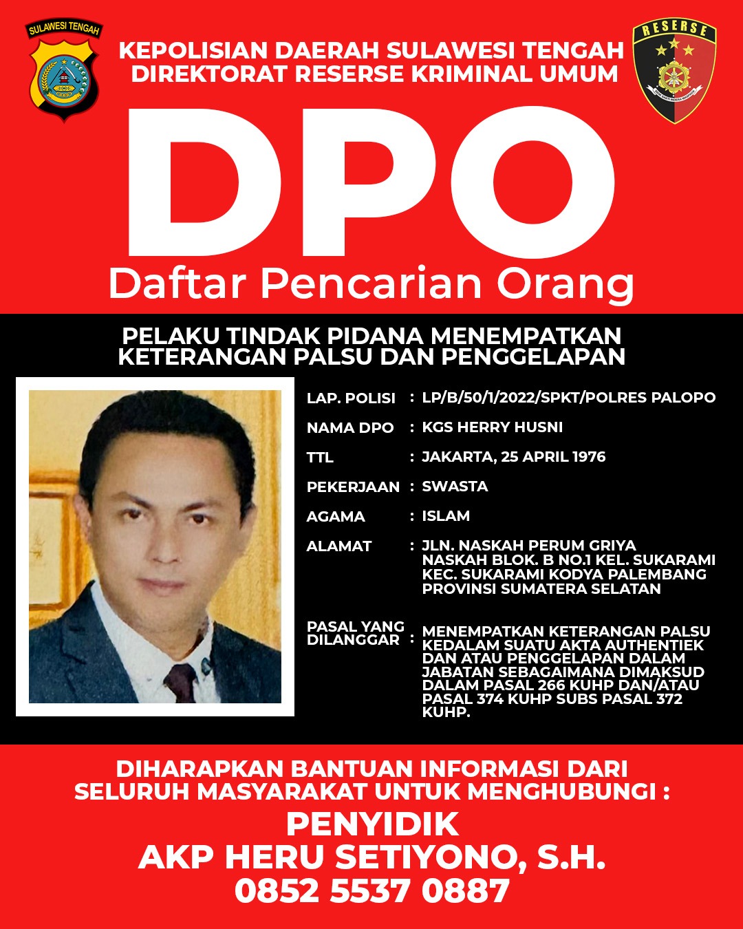 Tindakan penetapan status DPO dilakukan oleh tim penyidik Polda Sulteng setelah Herry dalam kapasitasnya sebagai tersangka berulang kali mengkir dari surat panggilan tanpa keterangan jelas.