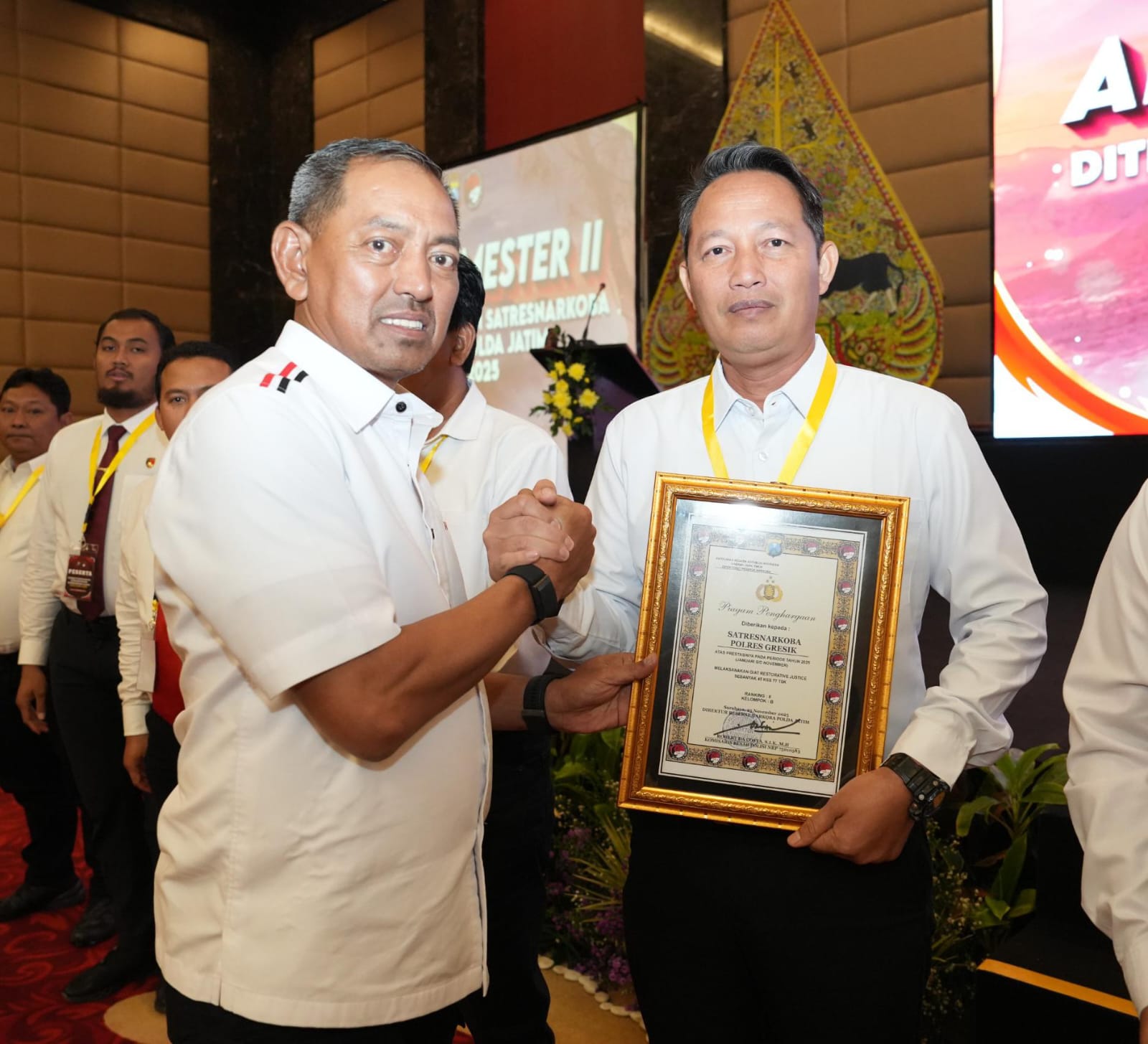 Penghargaan tersebut diserahkan langsung oleh Direktur Reserse Narkoba Polda Jawa Timur, Kombes Pol. Robert Da Costa, kepada Kasat Resnarkoba Polres Gresik, AKP Ahmad Yani, dalam kegiatan yang berlangsung pada Kamis hingga Jumat di Hotel The Singhasari Resort Batu, Kota Batu.
