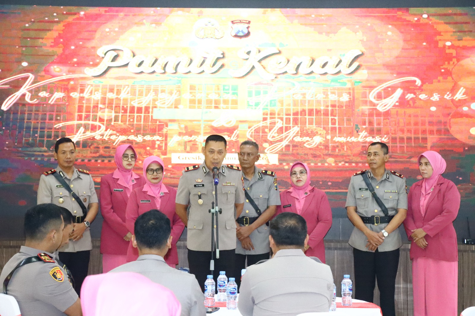 Dalam sambutannya pada sesi kenal pamit, Kapolres Gresik menyampaikan apresiasi dan terima kasih kepada para pejabat lama atas dedikasi serta pengabdian dalam menjaga kondusifitas kamtibmas di wilayah tugas masing-masing.