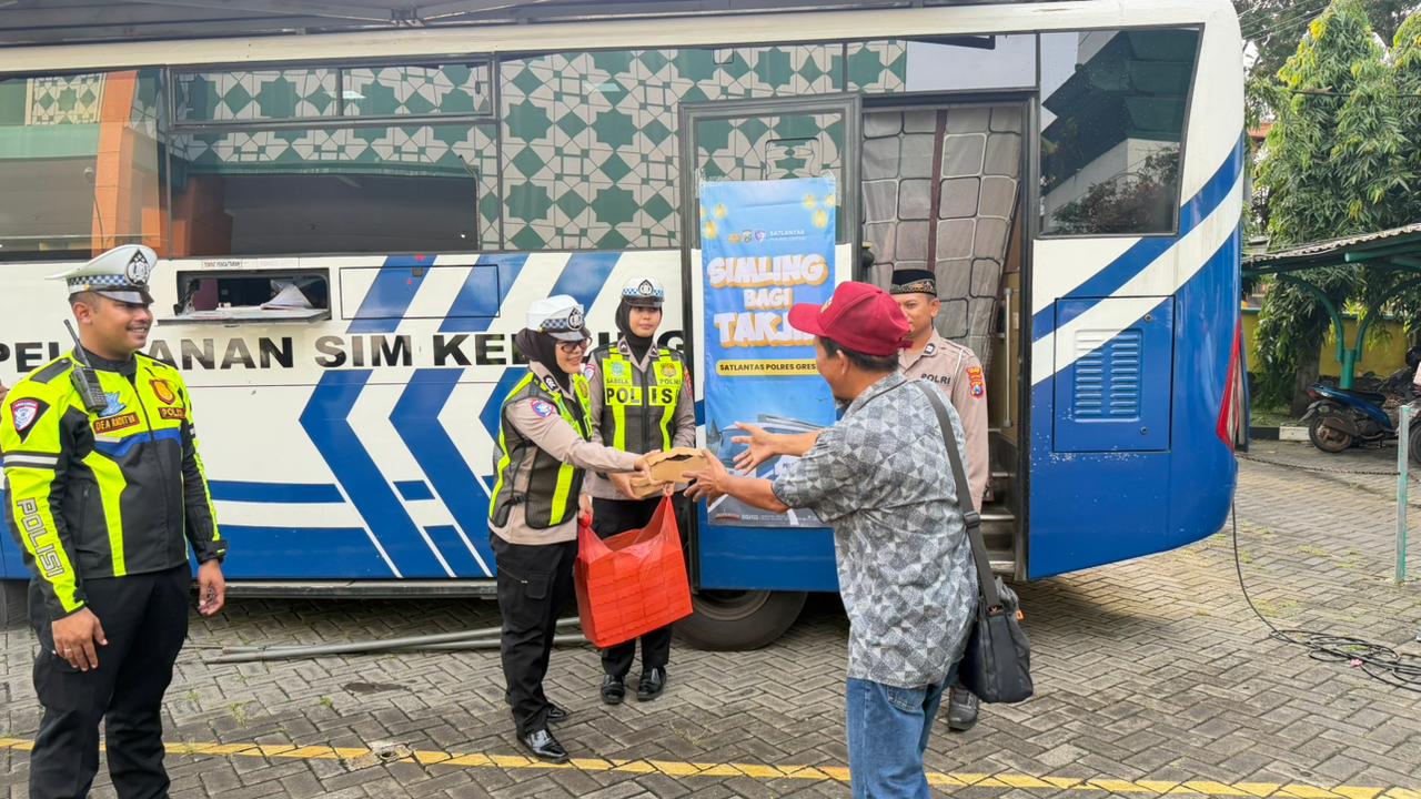 Tak hanya menghadirkan layanan administrasi, personel Satlantas Polres Gresik juga membagikan paket takjil gratis kepada para pemohon SIM serta pengendara yang melintas di sekitar area masjid.