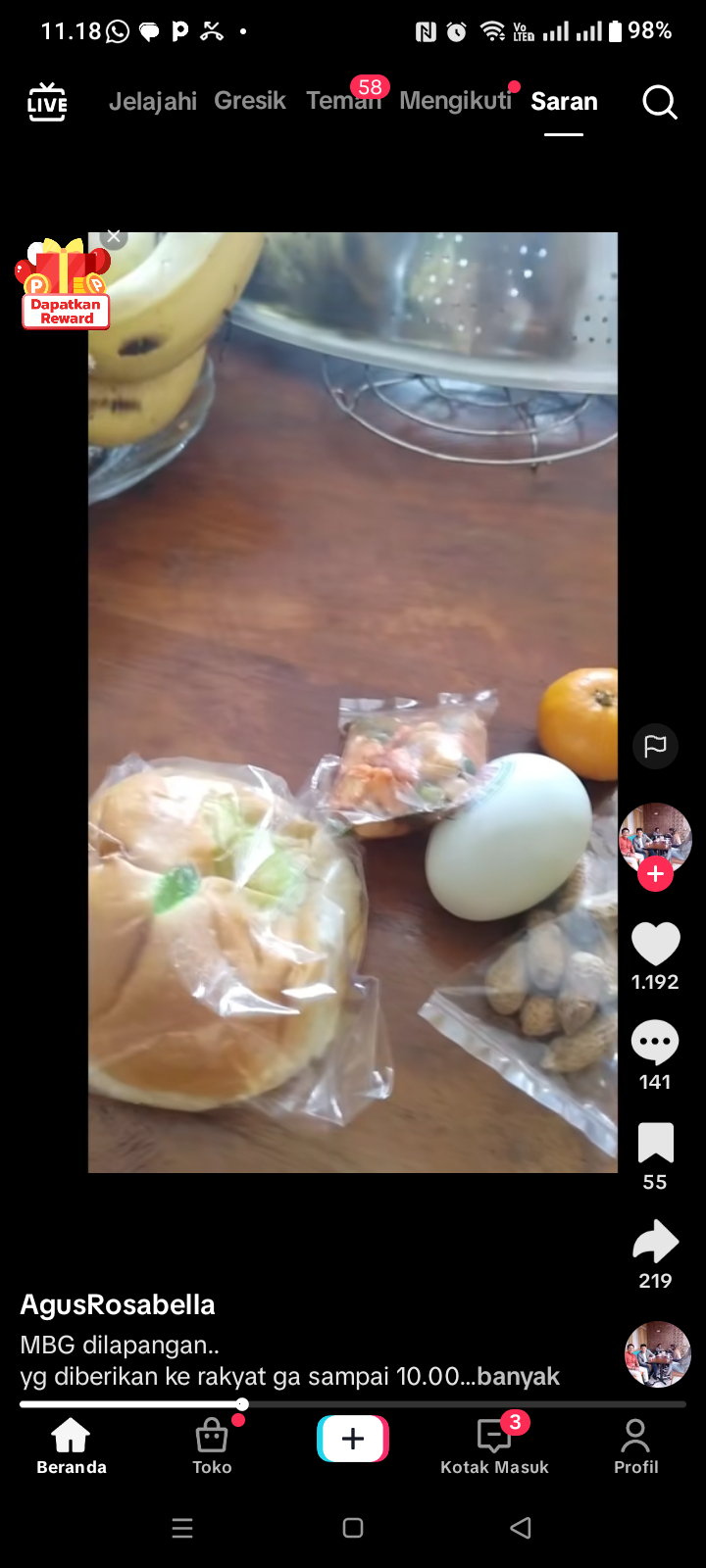 “Assalamualaikum, selamat siang, Om Swastiastu, Namo Budaya, salam kebajikan. Saya ingin spil MBG (makan bergizi gratis) hari ini. Onok kacang, Ono telur asin, ono roti seribuan, jeruk cilik, ini nggak sampai Rp10.000. Saya nggak tahu aturannya gimana. Jadi Rp15.000 itu katanya untuk makanannya itu Rp10.000, untuk manajemennya Rp 3.000, Rp2.000 untuk yang punya dapur. Tapi kenyataannya di lapangan ini haknya rakyat ini nggak sampai Rp7.000 atau Rp8.000. Jadi ini biar adil aja. Mestinya dapur itu tidak mengurangi haknya rakyat. Sudah dikasih rp5.000 untuk operasional, Rp 2000 dan Rp3000.”