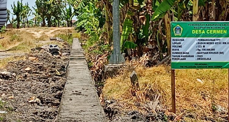 Proyek TPT Dusun Medeo, Cermen Lerek, Kec. Kedamean di Duga Ada Mark Up Anggaran dan juga Di kerjakan Asal Jadi. Berita|16/11/202316/11/2023oleh Redaksi Gresik. Mediabangsanews.com ||Proyek yang berada di Dusun Medeo RT 10 RW 05 Desa